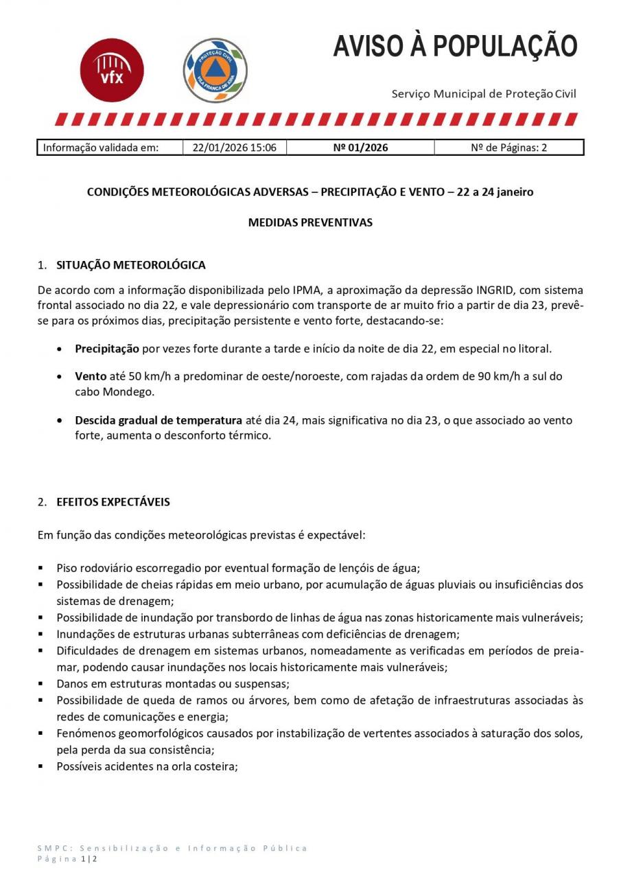De acordo com a informação disponibilizada pelo IPMA, a aproximação da depressão INGRID, com sistema frontal associado no dia 22, e vale depressionário com transporte de ar muito frio a partir de dia 23, prevê-se para os próximos dias, precipitação persistente e vento forte, destacando-se:
