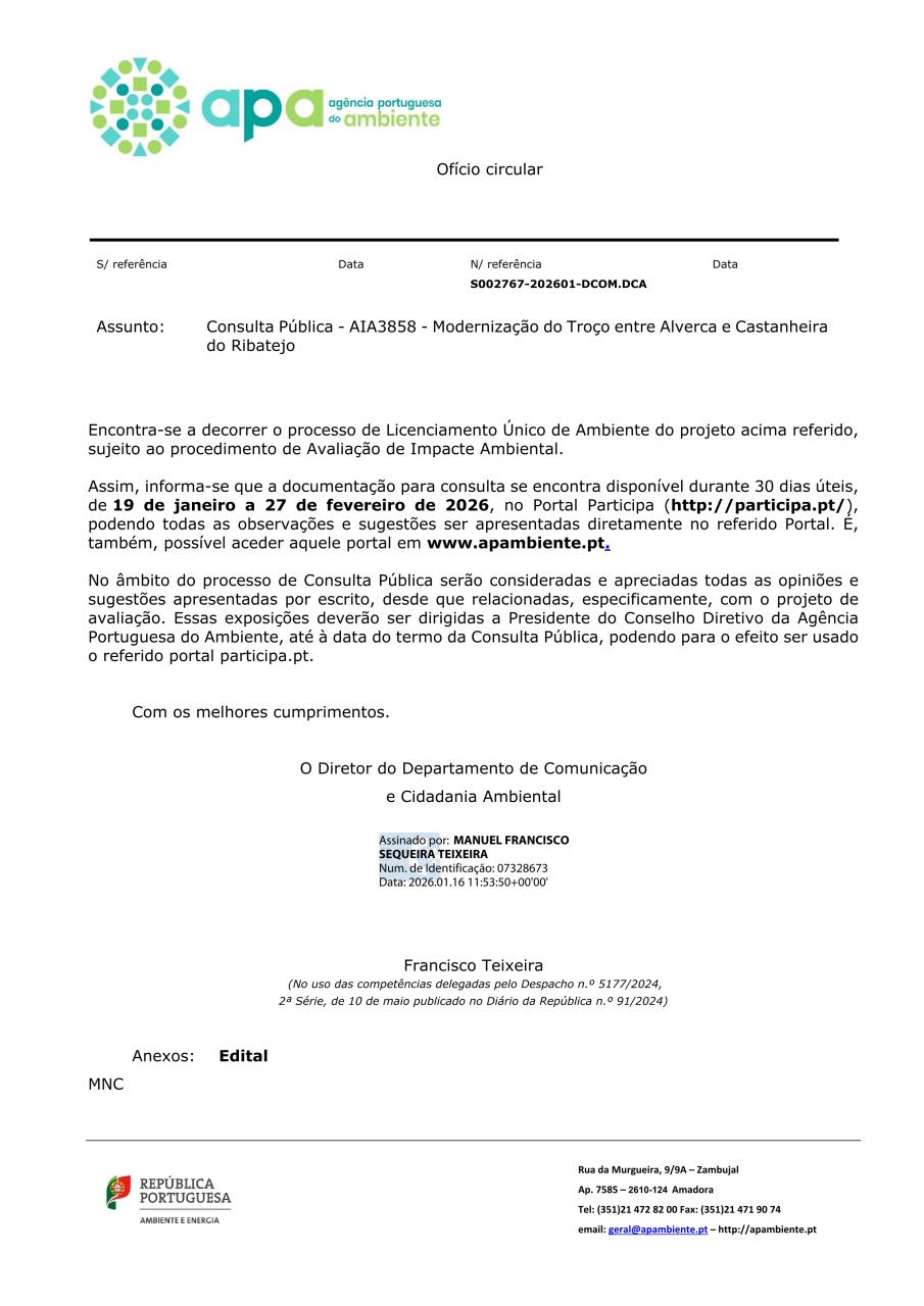 A documentação para consulta encontra-se disponível durante 30 dias úteis, de 19 de janeiro a 27 de fevereiro de 2026, no Portal Participa, em http://participa.pt/ ou em www.apambiente.pt, onde todas as observações e sugestões podem ser apresentadas.