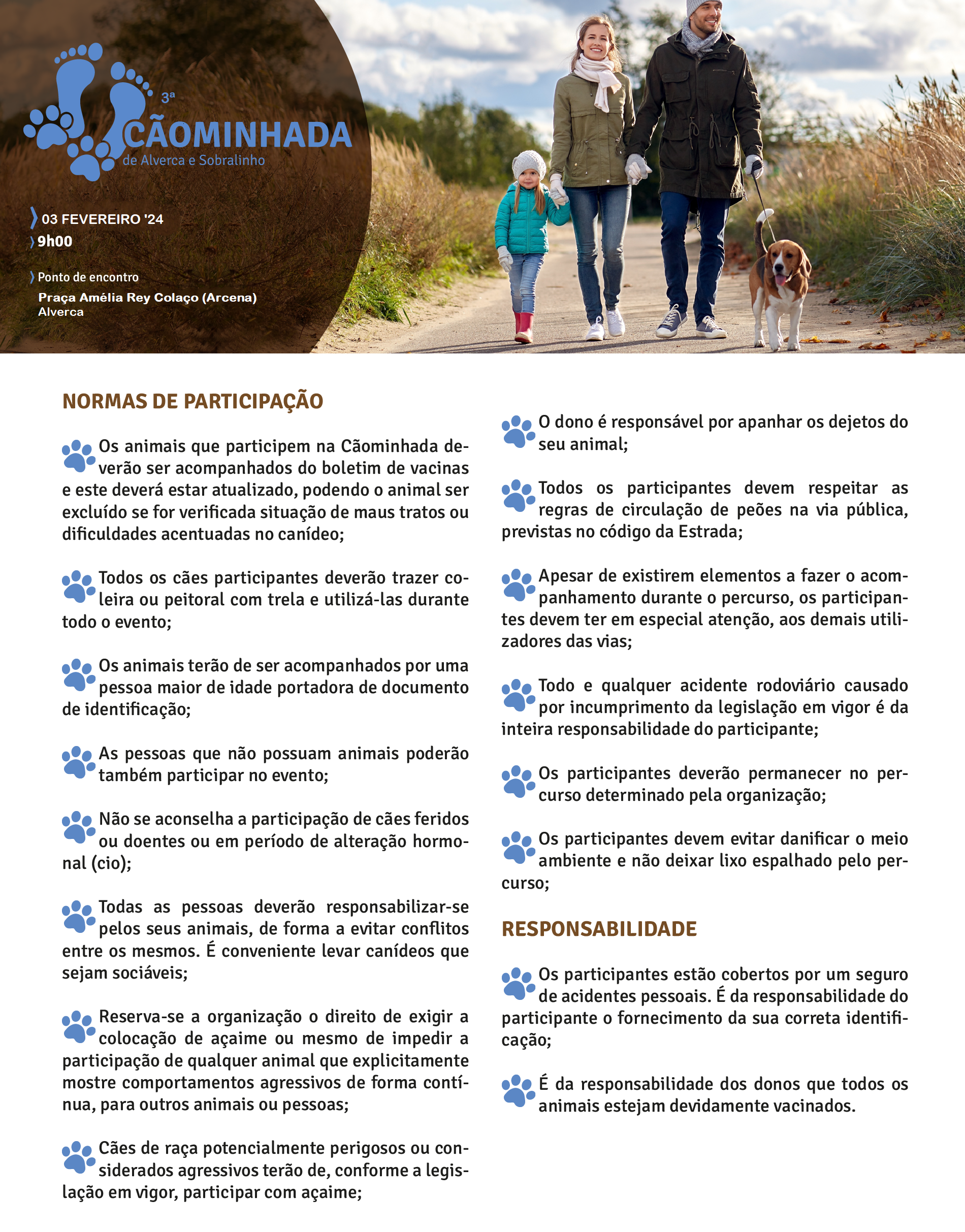 A 3.ª CãoMinhada vai acontecer em Arcena no próximo dia 3 de fevereiro (Sábado). O ponto de encontro será a Praça Amélia Rey Colaço (atrás da Casa do Povo e do Pavilhão Municipal).